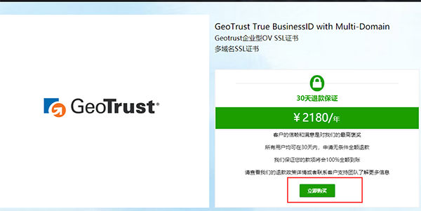 点击证书类型–企业型OV证书,在里面挑选一款适合自己的证书,点击“立即购买”(小编任意选择了一款),然后跳转到产品详情页(如下图),再点击“立即购买”