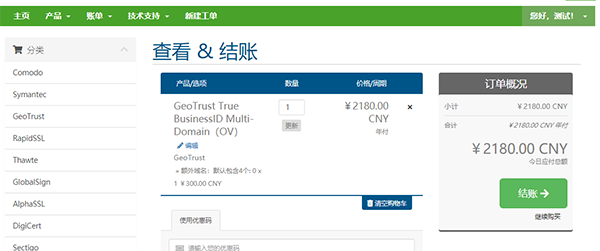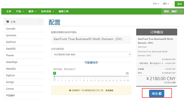 然后,选择一款合适的SSL证书类型进行申请(这里以申请OV SSL证书为例)